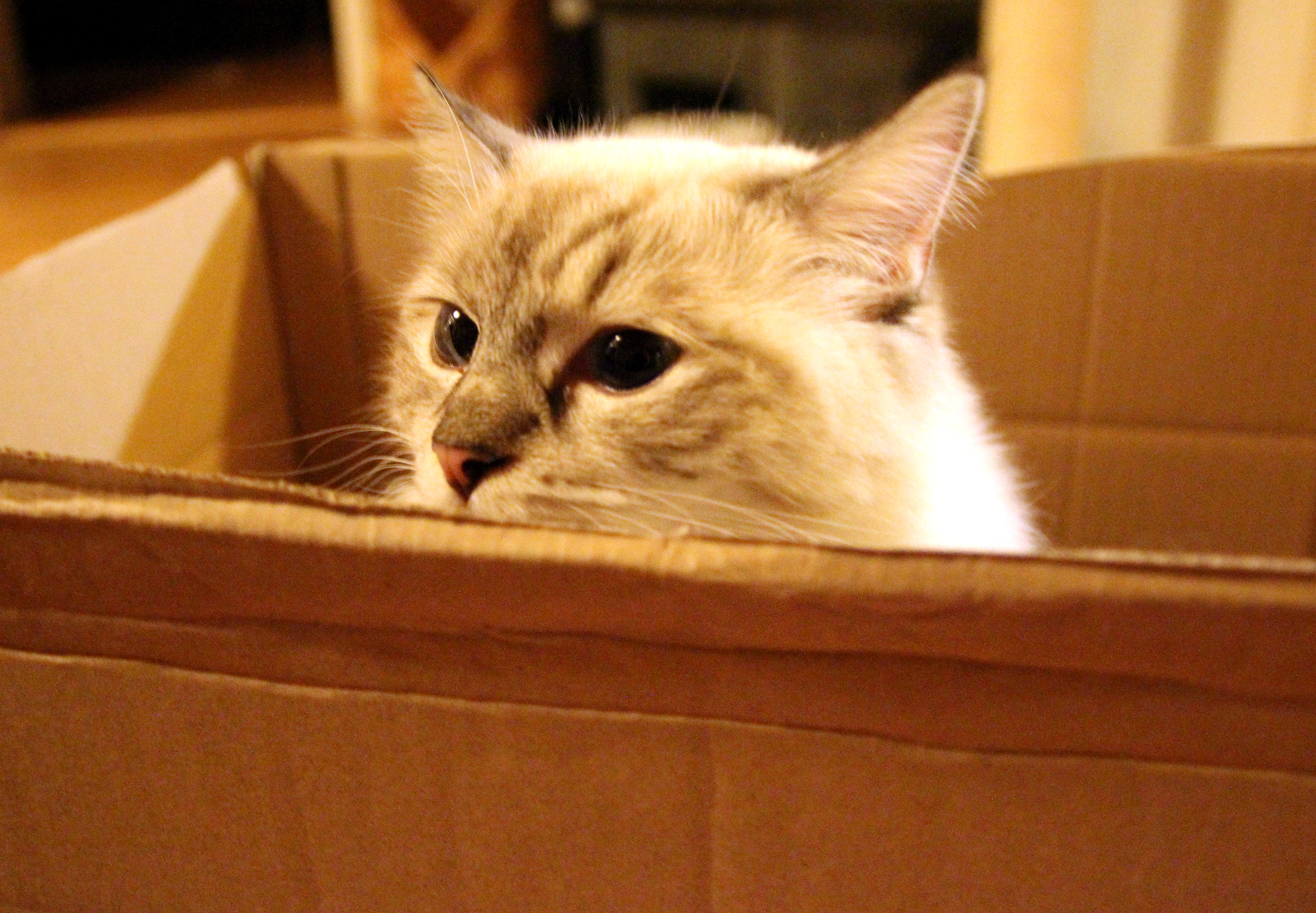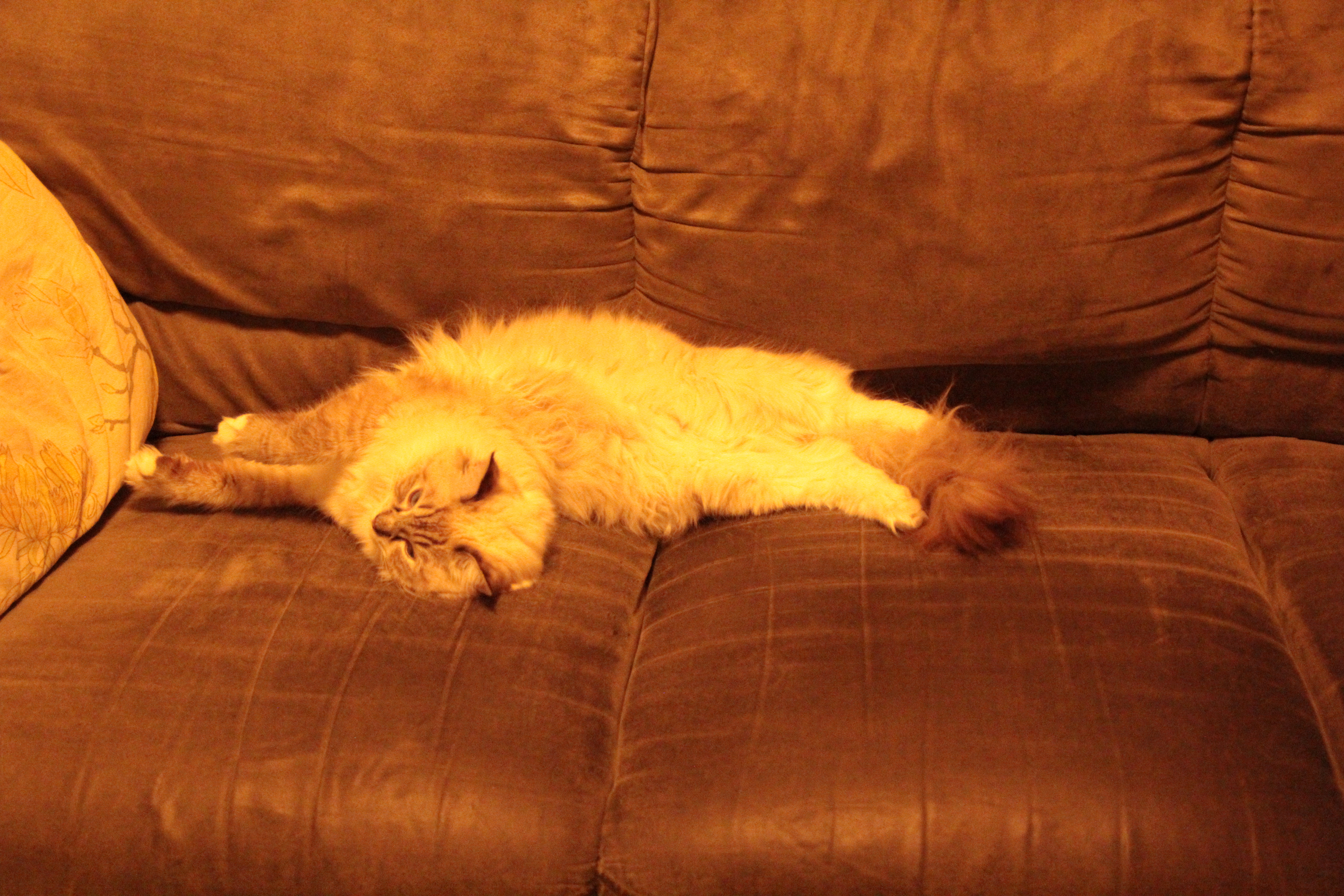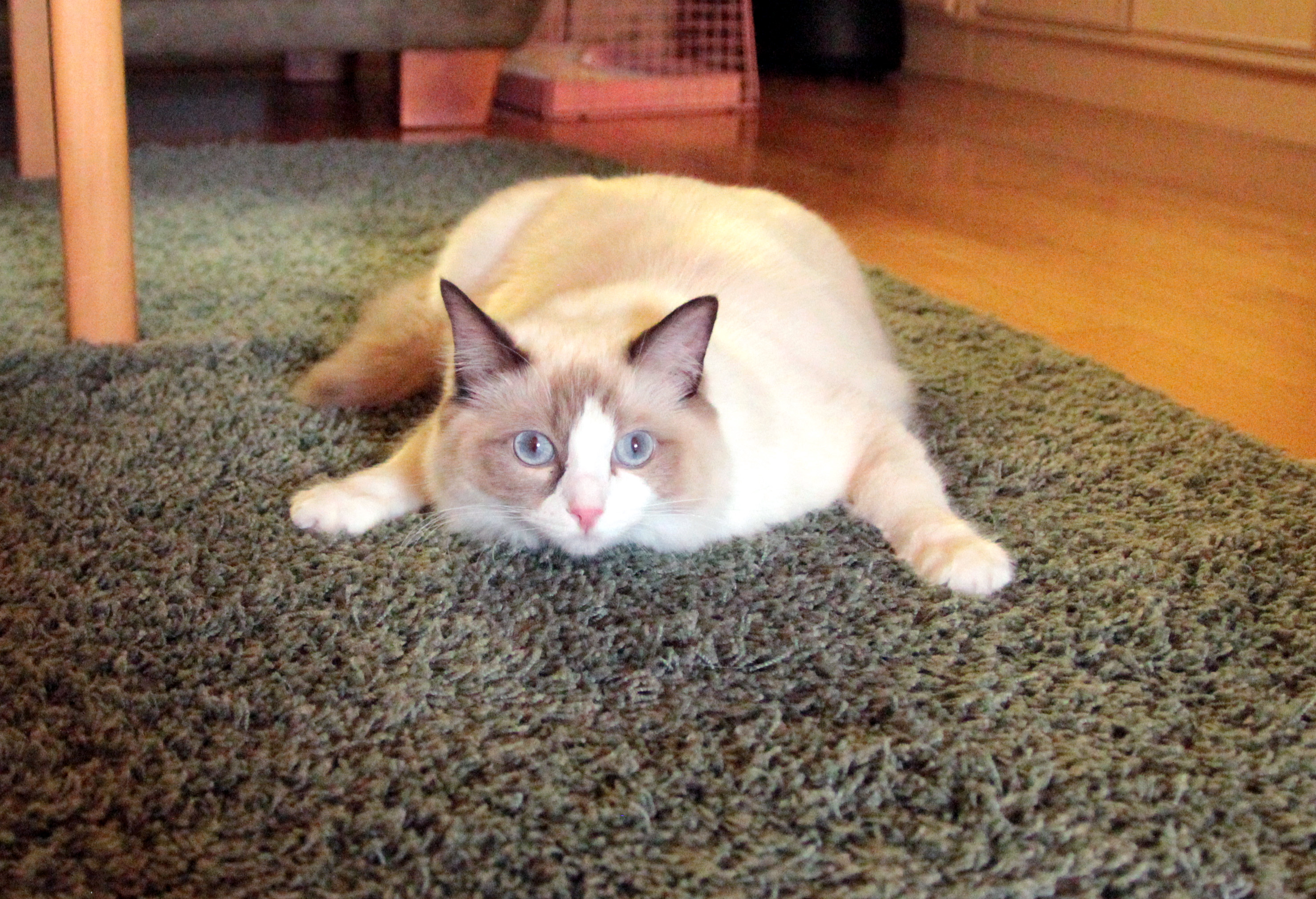 Hyvinkin usein sohvatyynyksi luultu pehmytkohde paljastuu jommaksi kummaksi meistä. Emme ihan aina ymmärrä saatikka tohdi muistaa jättien aistinelinten surkeutta, mutta ”ai siin onkin kissa!”  -lausahduksen kuullessamme saamme asiasta aina hyvän muistutuksen. Onneksi olemme välttyneet katastrofaalisilta päälleistumisilta ja nyt kun olemme kasvaneet aikuisen ragdollin mittoihin (Moona on 250 hiiren massaa eli tasan viisi kiloa ja Luna 10 hiiren massaa vähemmän), todennäköisyys moiselle onnettomuudelle pienenee kyllä oleellisesti. Tavallistakin tavallisempaa on tavata kuka tahansa kartanon kateista sohvalta istumasta tai makaamasta. Jäteillä on tapana erityisesti ilta-aikaan olohuoneessa oleillessa vähän laskeskella (sormiaan apuna käyttäen, tietenkin!), että mitenkä monta kissaa raapimapuussa ja sohvilla yhteensä onkaan. Jos tulos on alle kolme, jätit yleensä hieman huolestuneina lähettävät etsintäpartion tutkimaan kartanon etäisempiä sokkeloita. Rasmusta haetaan ensinnä pikkujättien sängystä, Lunaa pyykkejä varten saunaan jätetystä vadista ja Moonan löytämiseen riittää tavallisesti vilkaisu lattiatasolle.