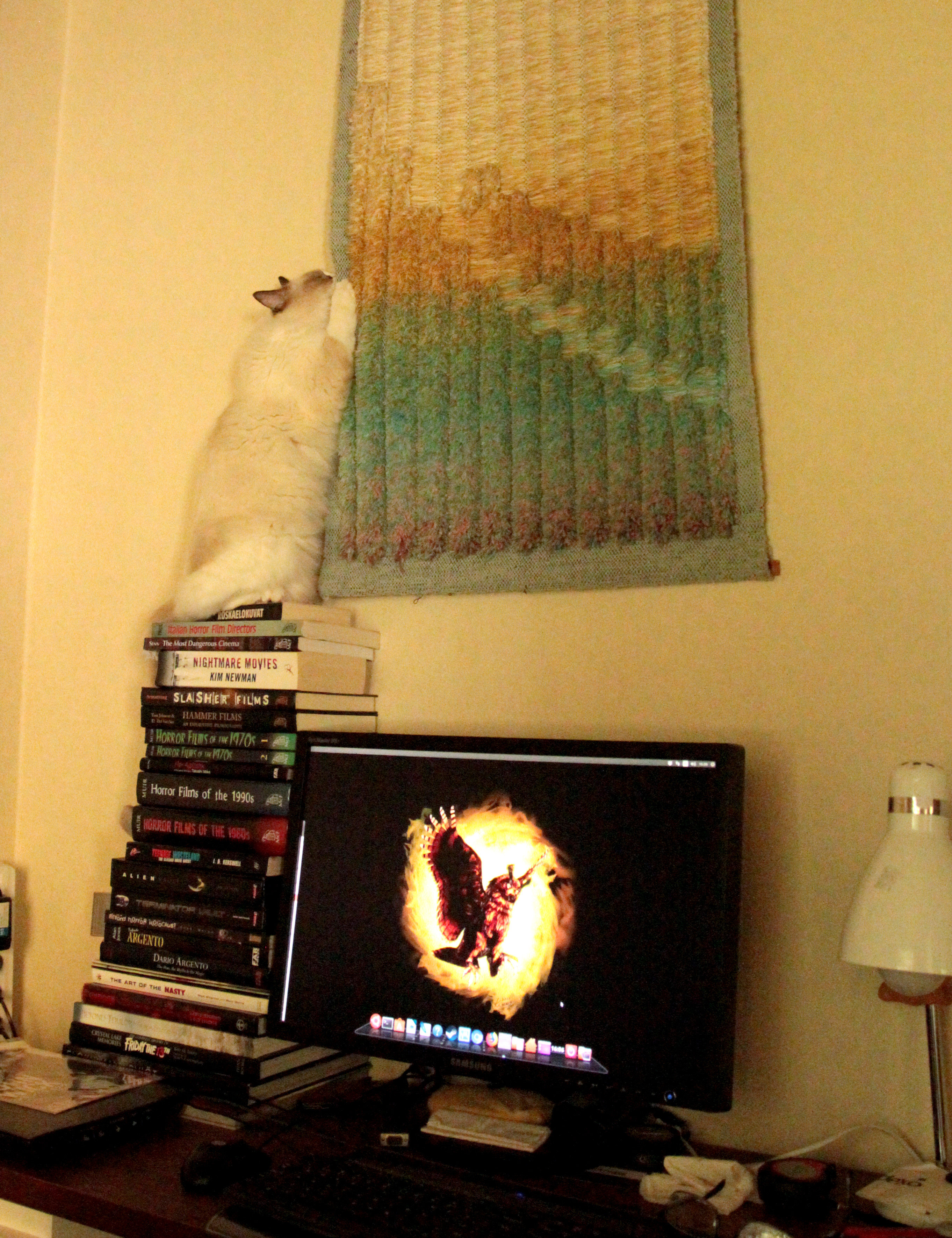 Ilolla voimme raportoida, että jättien lompakkoa syvältä kouraisseiden raapimapuukompleksien hankinta on osoittautunut peräti onnistuneeksi  hankinnaksi. Ihan siis oikeasti hyväksi eikä sarkastisella mielellä ollenkaan. Jykevämpi komplekseista saa osakseen rajua tykitystä liki jok’ikinen ilta, kun me painamme elämän ilosta menemään hippulat vinkuen ns. tuhatta ja sataa. Lepakkomieskin olisi kateellinen nähdessään, miten me pysymme paksussa rungossa kynsien avulla toisaalta paikoillamme painovoimaa uhmaten ja toisaalta pylvästä kiertäen kuin kisailevat oravat. Toinen suuri raapimapuumme on toki myös aika ajoin leikkikohde, mutta se on aikain saatossa vakioitunut meitä enemmän viehättäväksi lepäämisen tyyssijaksi. Tasoille emme enää mahdu nukkumaan kaksin, mutta tilaa on juurikin sopivasti yksinmakoiluun. Sitä paitsi sijoituspaikka on juuri sopiva myös pieneen virkistäytymiseen eli ohi menevien pahaa-aavistamattomien jättien pääkuuppien käpälöintiin lennosta. Luna on Moonaa selvästi innokkaampi hankkiutumaan ylempiin kerroksiin ja Moona taasen viihtyy mieluiten maan kamaralla tai sohvalla. Alla olevassa kuvasarjassa tosin Moona yrittää todistaa juurikin päinvastaista.