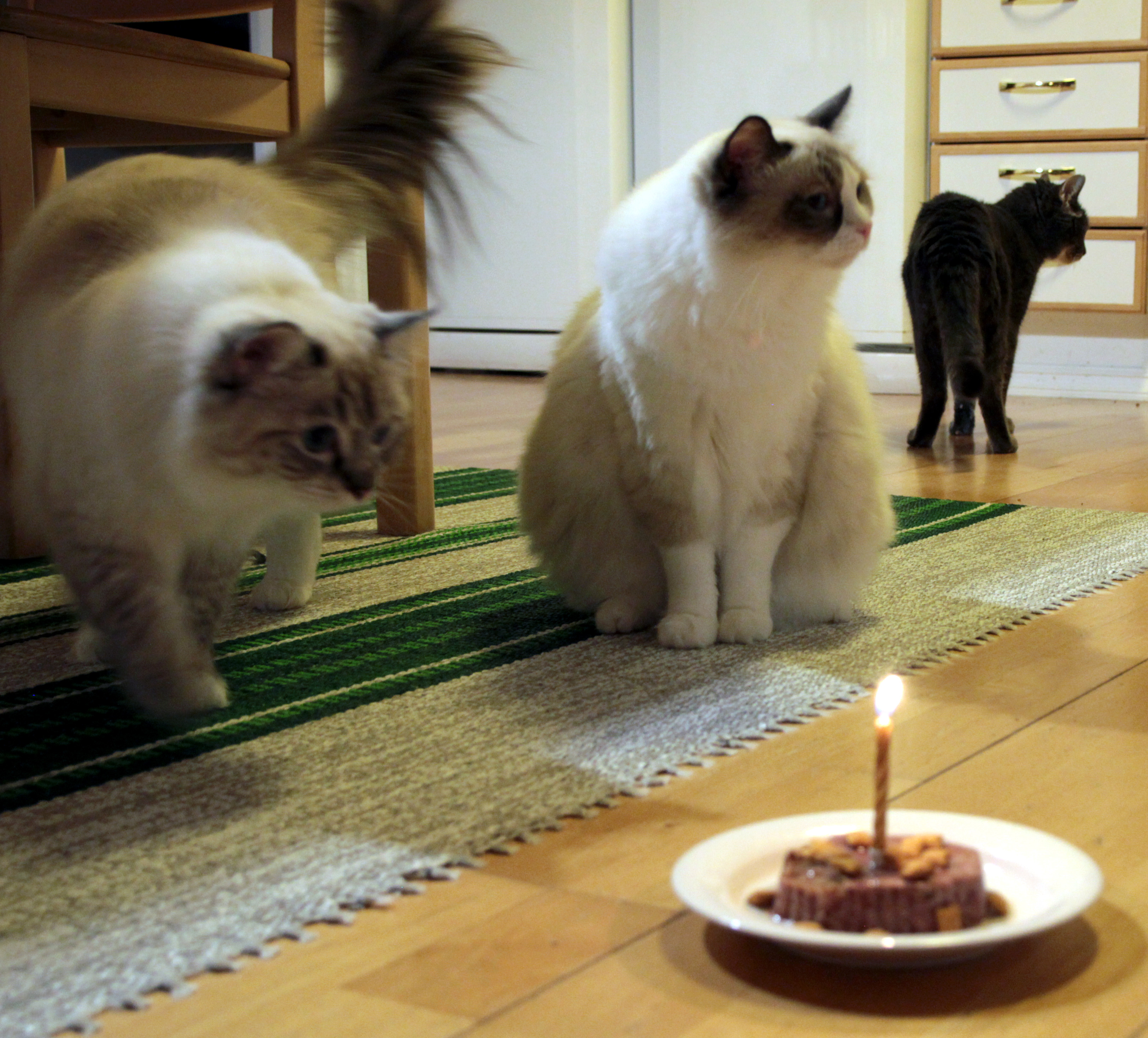 Synttärikakku! Rasmus ei patee-tyyppisistä pöperöistä piittaa, joten hän päätti pyllistää. Valkopalleroiden yleisistä luonteenpiirteistä voidaan tämänkin kuvan perusteella taas laulaa sitä samaa virttä eli Moona menee tutkimaan vaikka palavaa latoa ja Luna suhtautuu varauksellisemmin kaikkiin epämääräisen uusiin asioihin.